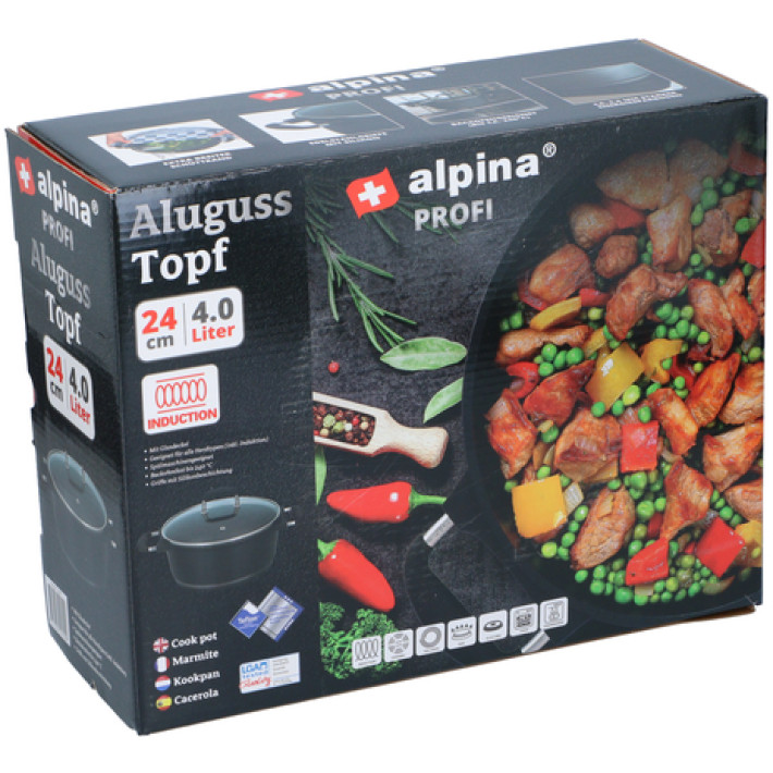 Šerpa alu Alpina aluminijska posuda za kuhanje dimenzije 24 x 11 cm. Debljina dna od 5 mm i debljina stijenke 2 mm. Zapremina šerpe je 4 l. Unutrašnji premaz šerpe Teflon Xtra, koji sprječava lijepljenje hrane za površinu posude i olakšava čišćenje.