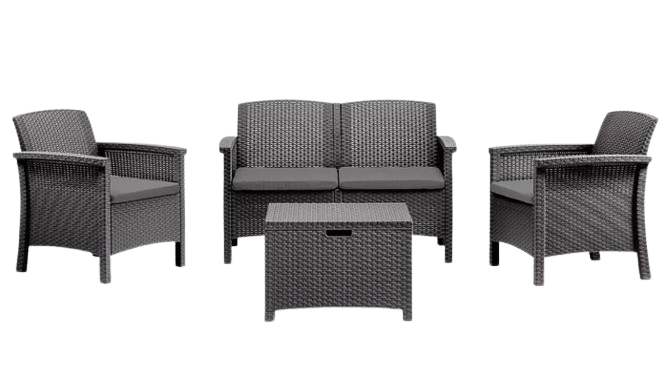 Garnitura VENEZIA 2+1+1 je set namještaja za 4 osobe inspiriran rattan dizajnom, ali izrađen od PVC imitacije ratana. Sastoji se od sljedećih elemenata: Dvije fotelje s visokim naslonjačem,sofom za 2 osobe,stolom sa prostorom za pohranu te 4 jastuka koji pružaju dodatnu udobnost prilikom sjedenja PVC imitacija ratana omogućava otpornost na vanjske uslove i olakšava održavanje, čineći je pogodnom za korištenje na terasi, u vrtu ili na drugim vanjskim prostorima.