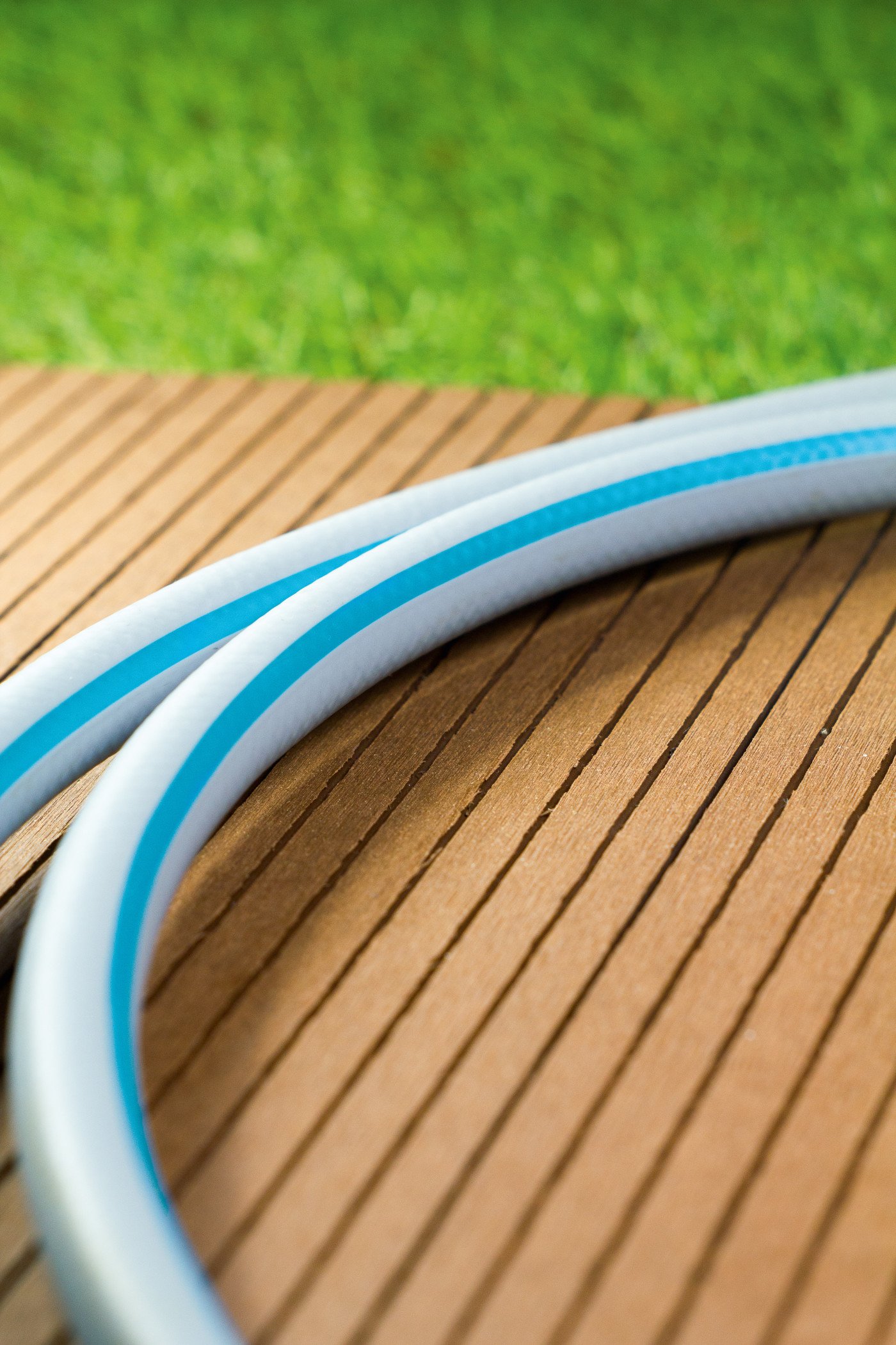 Vrtno crijevo BASIC 1/2 30M Cell - Fast je visokokvalitetno troslojno crijevo dizajnirano za vrtnu upotrebu. Crijevo je dodatno ojačano najkvalitetnijim predivom kako bi se povećala njegova izdržljivost i otpornost na habanje. Ovo osigurava da crijevo može izdržati različite uslove i intenzivnu upotrebu. UV stabiliziran, unutrašnji dio otporan na alge: Crijevo je dizajnirano da bude otporno na UV zrake, što mu omogućava da zadrži svoju izvornu boju i izdržljivost tokom dugotrajne izloženosti suncu. Također, unutrašnji dio crijeva je otporan na alge, sprječavajući njihov rast i održavajući čist unutrašnji dio crijeva.