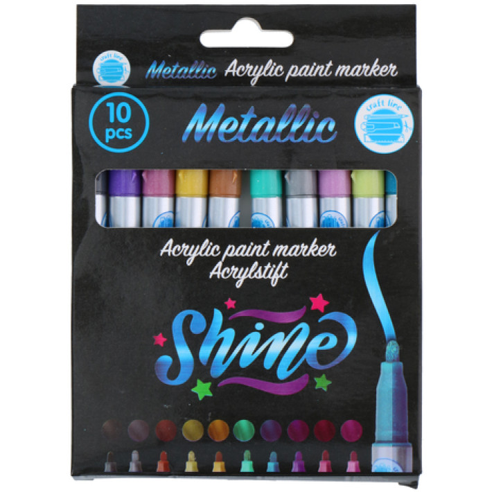 Craft Line set akrilnih markera sadrži 10 metalik markera za akrilnu boju, dimenzija 11,8 x 13 x 1 cm, težine približno 0,130 kg. Ovaj set je idealan za različite kreativne projekte i umjetničke radove, omogućavajući vam da dodate sjajne detalje svojim kreacijama.