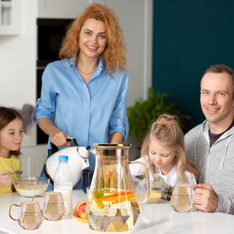 Bokal zapremine 1,8 litara zajedno sa četiri čaše je odličan set za posluživanje pića u vašem domu. Bokal je idealan za vodu, sok ili druge napitke, dok su čaše pogodne za serviranje pića gostima.