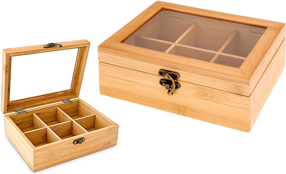 Kutija za čaj od bambusovog drveta je idealna za održavanje vaših omiljenih čajeva svježim i organiziranim. Dimenzije kutije su D 21 x Š 16 x V 7,8cm, a svaki odjeljak u kutiji ima dimenzije približno D 8,5 x Š 6 cm. Kutija ima lijep zatvarač za čuvanje svježe arome čaja.