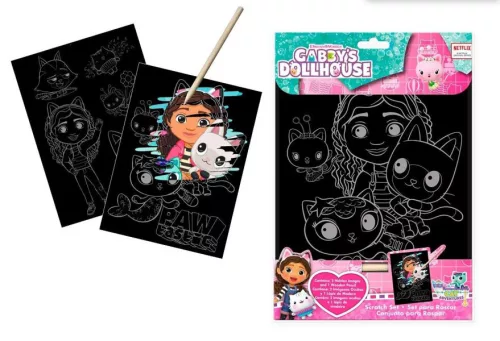 Stvorite magiju s Gabby's Dollhouse Scratch Art, koji uključuje 2 lista i olovku za grebanje, omogućavajući djeci da otkriju živopisne slike dok grebu po površini i izražavaju svoju kreativnost.