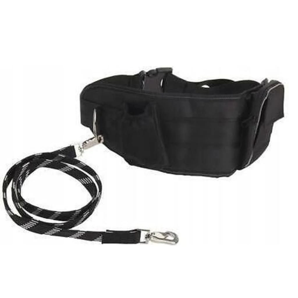 Povodac za pse sa pojasom crne boje, izrađen od polipropilena, ima podesiv pojas za kukove (70-110 cm) i povodac dužine 125 cm, sa najlonskom i elastičnom uzicom te reflektirajućim linijama za bolju vidljivost u uslovima smanjene svjetlosti.