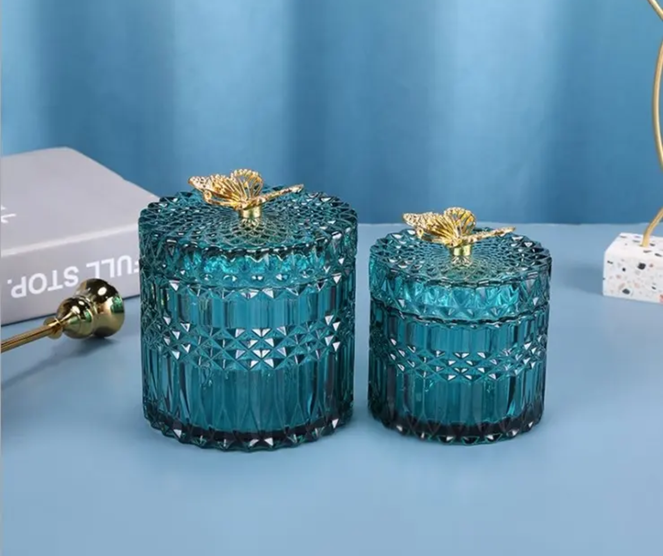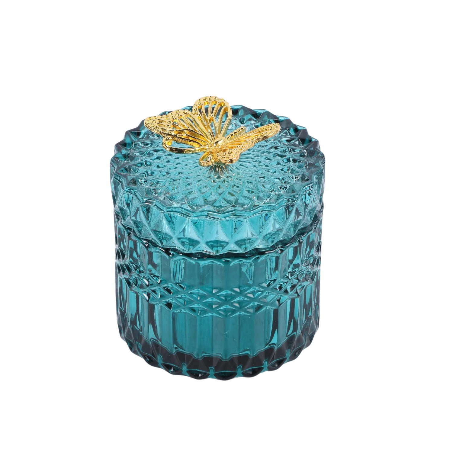 Šećernica sa poklopcem plave boje je izrađena od stakla, što joj daje elegantan i prozračan izgled. Poklopac pomaže u očuvanju svežine šećera i sprečava ulazak vlage. Ova staklena šećernica je idealna za postavljanje na sto ili u kuhinju, dodajući estetski šarm.