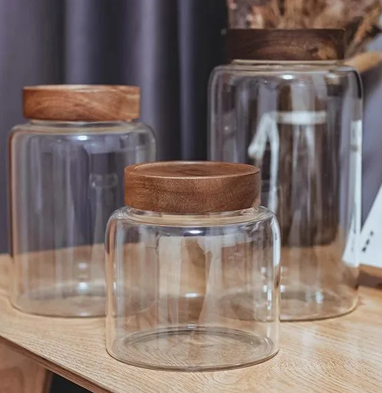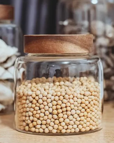 Stakleni galon sa poklopcem bambus 13x13 cm je elegantan i praktičan za čuvanje namirnica u kuhinji.