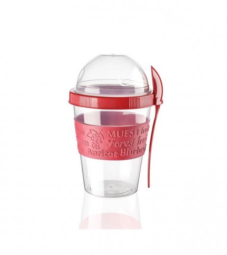 Nepropusna posuda za jogurt s poklopcem ima dva spremnika: prozirni gornji spremnik (gdje možete čuvati granolu, žitarice ili voće) sklapa se sa donjim dijelom (gdje možete čuvati jogurt ili mlijeko) i, kao što je spomenuto, nepropusan je tako da nema rizika od nesreća. Uključena je i snažna plastična kašika bez BPA koja se može objesiti na držač za kašiku radi jednostavnog odlaganja.