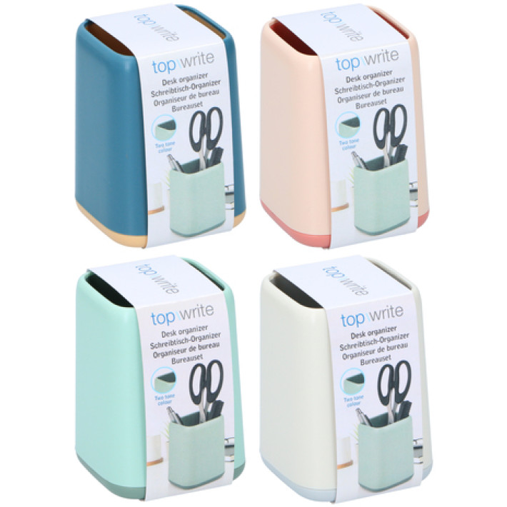 Organizer za radni sto Topwrite 398 dvobojni je praktično rješenje za održavanje urednosti na radnom stolu. Ima jedan jednostruki pretinac i dizajniran je u dvobojnoj kombinaciji, te omogućava skladištenje olovki, markera, i drugih uredskih potrepština, u kompaktnim dimenzijama 8x8x10,8 cm.
