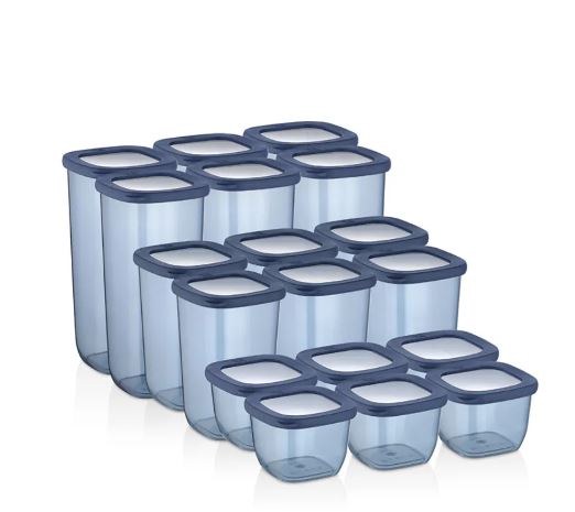 SET POSUDA ZA ODLAGANJE KUMSAL 18/1 TAMNO PLAVA sastoji se od 18 posuda za odlaganje hrane koje su dostupne u tri različite veličine: 6x500 ml, 6x1200 ml i 6x1750 ml.