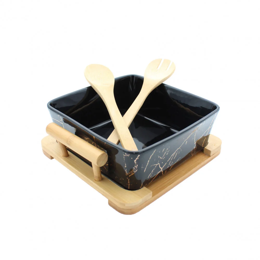 Ova elegantna zdjela za serviranje na drvenom pladnju idealna je za svečane prilike i svakodnevnu upotrebu. Zdjela je izrađena od visokokvalitetnog materijala u crnoj boji, što je čini modernom i sofisticiranom. Drveni pladanj pruža dodatnu toplinu i rustičan šarm, čineći ovaj set savršenim dodatkom vašem stolu. Ova zdjela garantuje da će vaši obroci biti servirani s elegancijom i stilom.